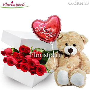 Caja con 12 rosas rojas + peluche chico + globo mediano 9".