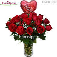 Enamorala con este arreglo de 18 rosas premium de tallo largo en florero de vidrio + globo mediano 9".