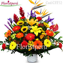 Arreglo floral clasico con flores mixtas de estación, contiene gerberas holandesas, girasoles, lilium, claveles, esterlicias, iris y follajes en base de ceramica.