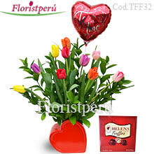 Arreglo con 10 tulipanes en base de ceramica en forma de corazon + globo mediano + truffas helena.