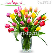 Arreglo con 25 hermosos tulipanes en florero de vidrio alto.
