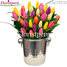 Arreglo con 30 bellos y coloridos tulipanes en elegante hielera metalica