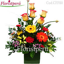 Colorido arreglo floral con 5 rosas, astromelias, claveles, y follajes en base de ceramica.