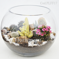 Microarreglo de cactus con tecnica terrarium que permite cultivar cactus dentro de un recipiente sin desfogue de agua.
