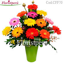Arreglo con 12 hermosas y coloridas gerberas holandesas en base de cerámica.