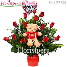 Arreglo con 12 rosas y follajes + peluche chico + globo mediano en base de cerámica.