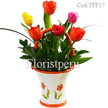 Encantador arreglo floral con 6 coloridos tulipanes en base de cerámica.