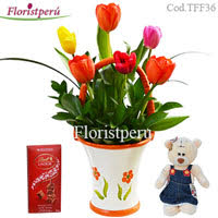 Arreglo con 6 coloridos tulipanes en base de cerámica + mini osita + barra chocolate 100g.