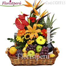 Canasta con deliciosas frutas seleccionadas de estación, arreglo floral, Whisky Chivas Regal y Riccadonna Asti.