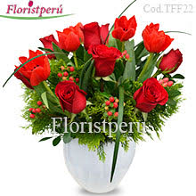 Arreglo floral con 6 rosas, 6 tulipanes y follajes en base de cerámica.