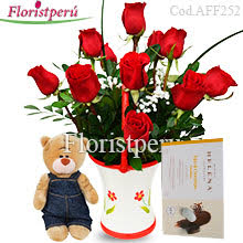 Arreglo floral con 12 rosas y follajes en base de cerámica, peluche chico y tejas helena x 6.