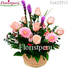 Decorativa canasta con 7 rosas, liatris, gerberas y follajes. Ideal para cumpleaños.