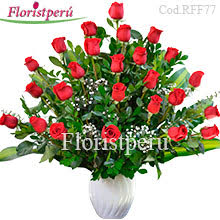 Encantador arreglo floral con 24 hermosas rosas y follajes en base de ceramica.