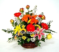 A nice brown basket with a mix fresh cut flowers : Gerberas, Sunflowers, Carnations ,Roses ,lillium and greens.