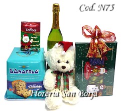 Medium Christmas teddy bear, Champagne Queirolo 750ml, Bombons Helena 210g, Fruit cake D“nofrio, toffees La Iberica 150g, christmas tray