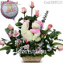 Basket with 7 beautiful roses, astromelias, greens, medium plush animal + medium balloon.