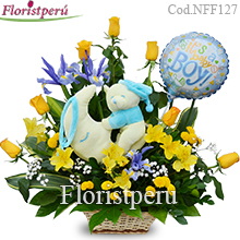 Basket with 7 beautiful roses, iris and greens with sweet teddy bear + medium balloon.