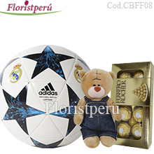 Adidas Ball Nª 5 + mini teddy bear + Box of Ferrero Rocher bombons 100g all in basket.