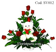 To that special person an arrangement with 12 beautiful roses and greens + small teddy bear in a basket