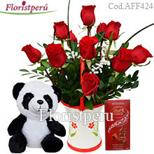 Flower arrangement with 12 roses and greens in a ceramic vase + small panda bear + Lindt Chocolates 100g.