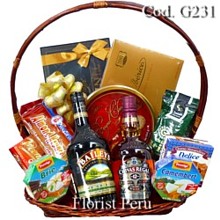 Contains: Chivas Regal Whisky 750ml, Baileys Irish Cream, Helena Bombons 210g, 2 imported cheese, Danish cookies, alfajores tinkay, Voortman cookies, Villa Rica Cafe, Delice cheese, Peccanroll chocolate 100g, all in a basket or tray.