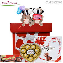 Romantic box with a couple of plush animals, bombons ferrero rocher 100g, peccanroll chocolate and belgian chocolates 200g.