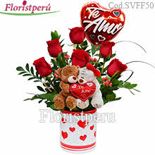 Flower arrangements with 6 roses and greens in ceramic base + small couple of teddy bears + medium balloon 9".